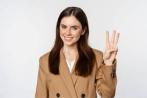 portrait-of-corporate-woman-saleswoman-showing-number-three-fingers-and-smiling-standing-in-suit-ove