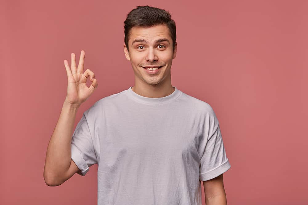 Studio photo of joyful young brown eyed man with dark hair posing over pink background in grey t-shirt, looking to camera happily and smiling widely, raising hand with ok gesture