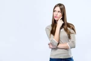 Beautiful young woman thinking over white background.