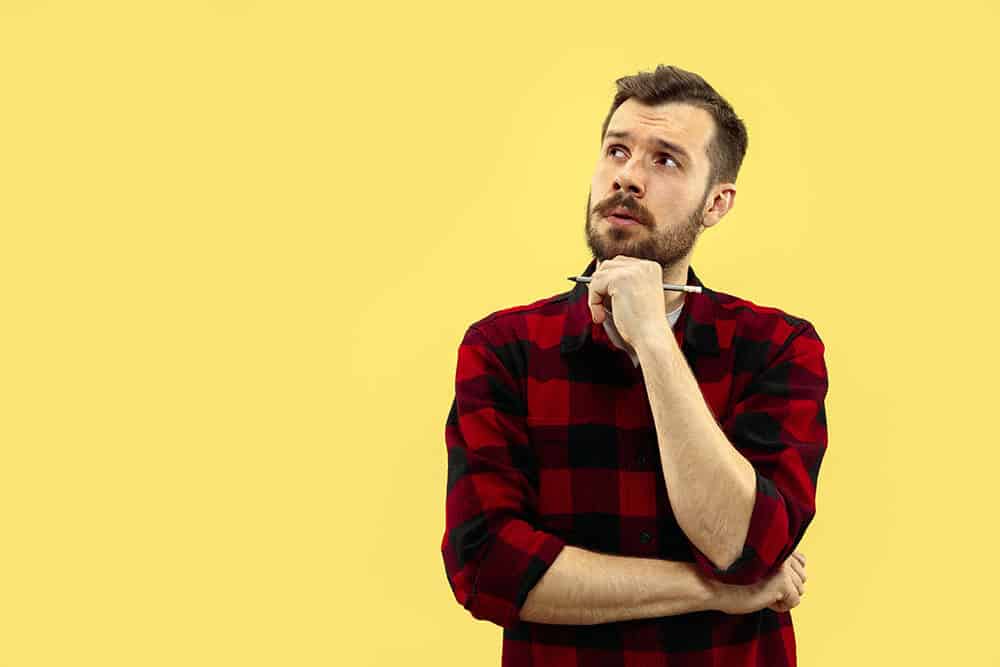 Half-length close up portrait of young man on yellow background.